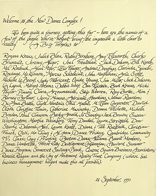 Through successful negotiations with lending institutions, the City of Cambridge, and community effort The New Dance Complex Inc. (The Dance Complex) is established on September 21st, 1991.
